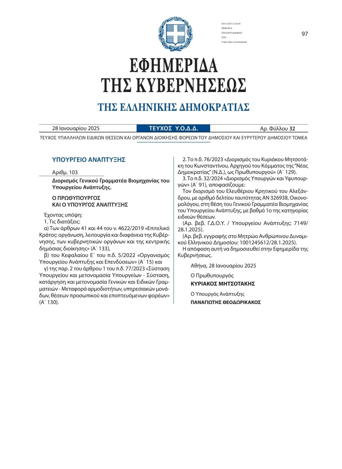 Σύμφωνα με το ΦΕΚ, το οποίο δημοσιεύτηκε χθες, με απόφαση του πρωθυπουργού Κυριάκου Μητσοτάκη και του υπουργού Ανάπτυξης Τάκη Θεοδωρικάκου διορίζεται γενικός γραμματέας Βιομηχανίας στο εν λόγω Υπουργείο ο Τρικαλινός, Λευτέρης Κρητικός.