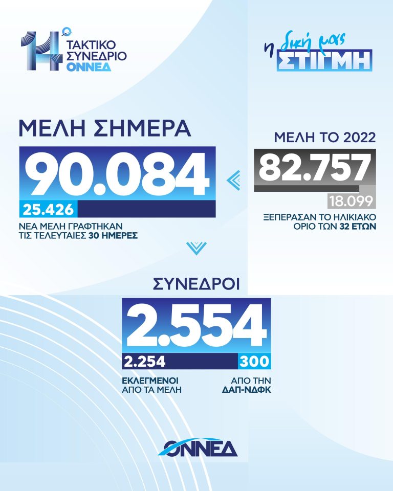 Συνολικά, στο Εθνικό Μητρώο Μελών της ΟΝΝΕΔ είναι πλέον εγγεγραμμένα 90.084 μέλη. Για το 14οΤακτικό Συνέδριο αναδείχθηκαν 2.254 σύνεδροι, αριθμός αυξημένος σε σχέση με το προηγούμενο Συνέδριο του 2022, ενώ επιπλέον 300 σύνεδροι προέρχονται από τη ΔΑΠ–ΝΔΦΚ, σύμφωνα με τον Κανονισμό Λειτουργίας της ΟΝΝΕΔ. Αξιοσημείωτο είναι το γεγονός πως ενώ 18.099 μέλη ξεπέρασαν το ηλικιακό όριο, μέσα σε 30 ημέρες εγγράφηκαν στο Εθνικό Μητρώο Μελών της ΟΝΝΕΔ 25.426 νέα.