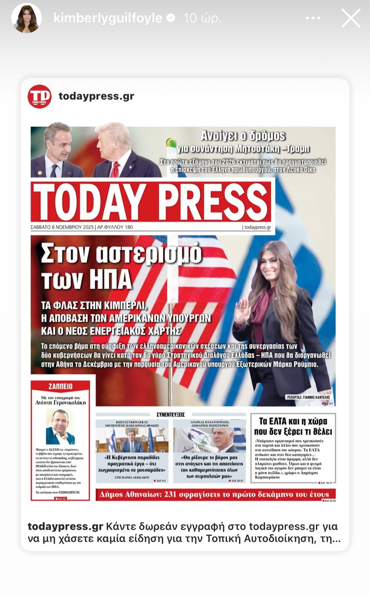 Η Κίμπερλι Γκίλφοϊλ διαβάζει Today Press και δεν το κρύβει. Η φωτογραφία από τον προσωπικό της λογαριασμό στο Instagram το επιβεβαιώνει καθώς η ίδια μοιράστηκε το πρωτοσέλιδο της εφημερίδας μας και συγκεκριμένα το τεύχος 180.