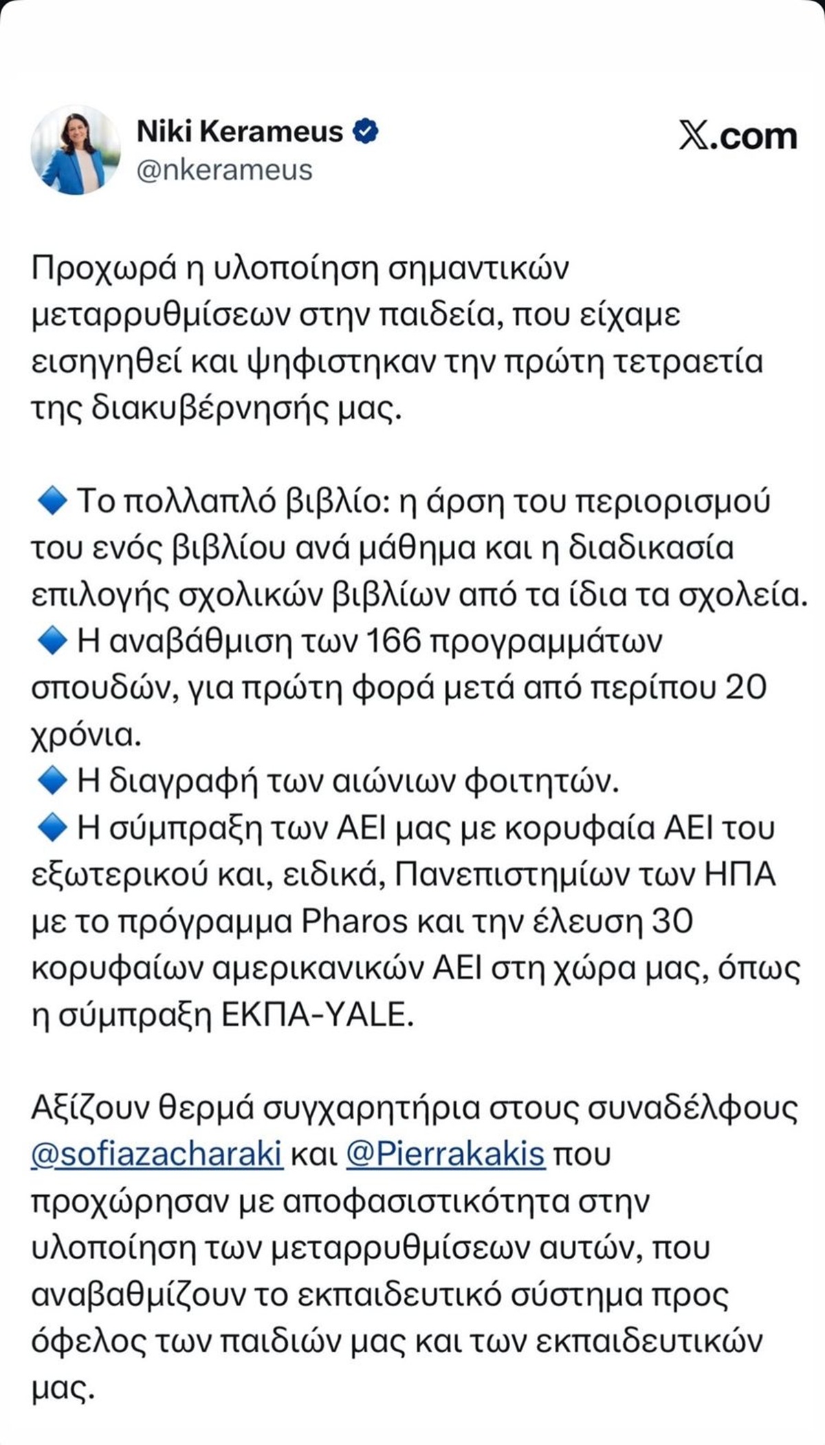 Με πρόσφατη ανάρτησή της στα social media, η Υπουργός Εργασίας Νίκη Κεραμέως μας θύμισε ό,τι καλό έχει κάνει το Υπουργείο Παιδείας επί θητείας Σοφίας Ζαχαράκη —και όχι μόνο είναι δικό της έργο, για να είμαστε δίκαιοι—, στο τέλος όμως ευχαρίστησε και την ίδια και τον Κυριάκο Πιερρακάκη που το συνέχισαν!